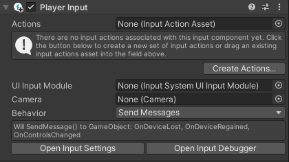 캐릭터 오브젝트에 Player Input 컴포넌트를 추가해주고, [Create Actions...] 버튼으로 기본값들로 세팅된 에셋을 만들어줍니다.