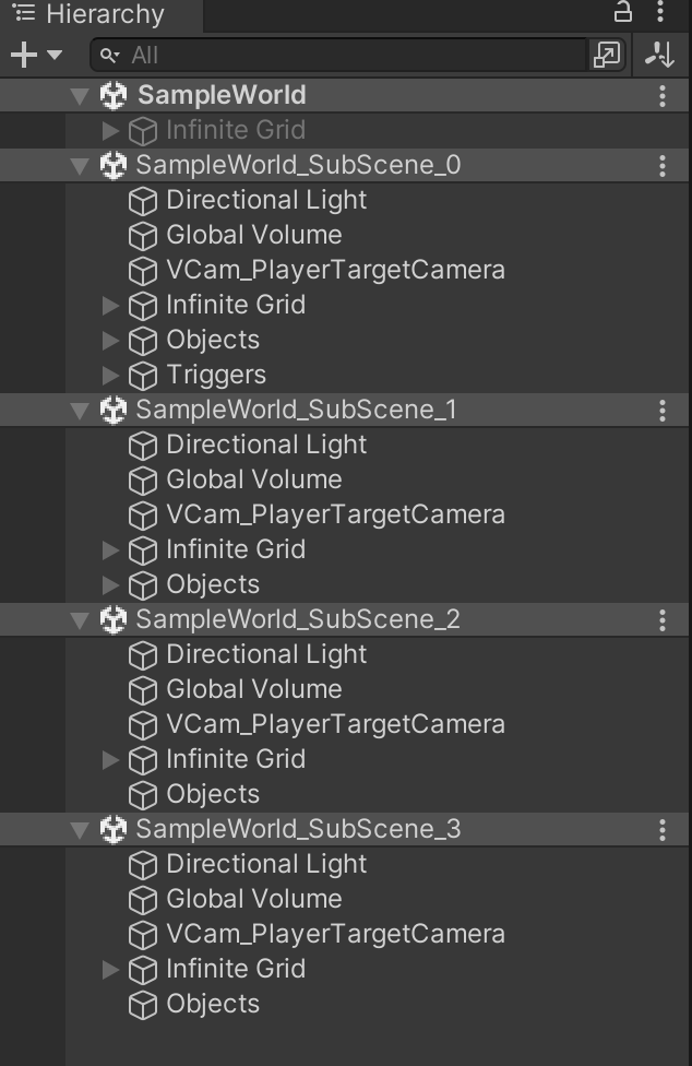 각각 서브 씬들마다 Directional Light, Volume, Virtual Camera 설정해주고, Trigger들도 설정해주었습니다.