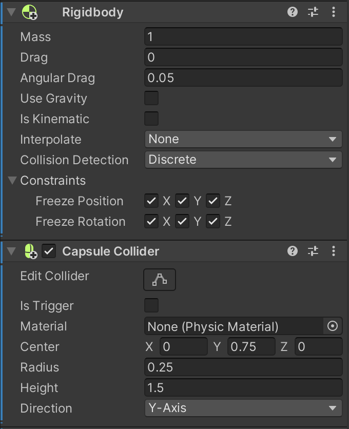현재는 물리 관련 동작을 사용하지 않을 것이기 때문에 useGravity를 false로 해주고 position, ration을 모두 freeze 해주었습니다.