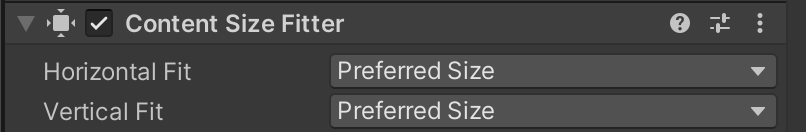 Content Size Fitter Properties Property: Function: Horizontal Fit How the width is controlled. Unconstrained Do not drive the width based on the layout element. Min Size Drive the width based on the minimum width of the layout element.
