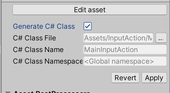 InputAction 에셋에 Generate C# Class 체크박스가 있는데 이 부분을 체크하고 Apply버튼을 눌러서 C#클래스로 만들어줄 겁니다.