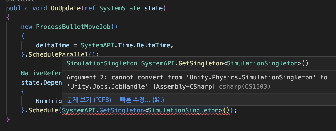 아마도 위에서 구현한 ProcessBulletMoveJob에서 물고 있어서 나오는 에러로 보입니다.
