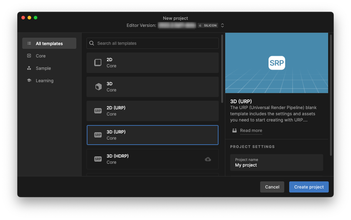 3D (URP)템플릿으로 새 프로젝트를 생성합니다. 이전에3D (URP)템플릿을 사용한 적이 없다면, 다운로드 해야합니다. - 프로젝트가 로드되면