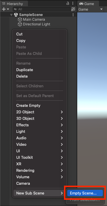 2. Hierarchy창에서 마우스 오른쪽 버튼을 클릭하고 New Subscene > Empty Scene...을 선택합니다. 새 Scene의 이름을 "EntityScene"으로 지정하고 Scenes/SampleScene에 넣습니다.