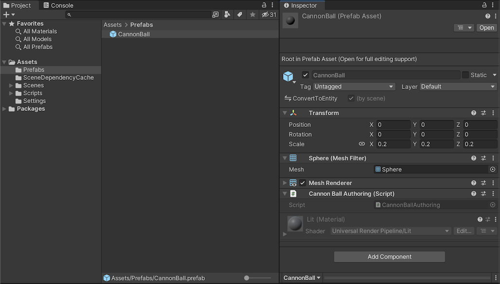 3. "CannonBall" GameObject에 "CannonBallAuthoring" 구성요소를 추가합니다.