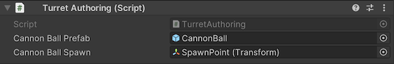 8. "Turret" GameObject를 선택하고 "Turret Authoring" Component의 새 필드 "CannonBallPrefab" 및 "CannonBallSpawn"을 Project창에서 "CannonBall" Prefab, Hierarchy창에서 "SpawnPoint" GameObject 각각 드래그 앤 드롭으로 등록해줍니다.