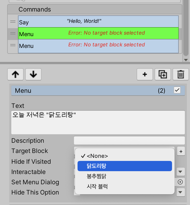 시작 블럭으로 돌아와 이전에 추가한 Menu Command를 선택하고 [Target Block]을 선택하고 이전에 추가한 닭도리탕 블럭과 봉추찜닭 블럭을 각각 선택해줍니다.