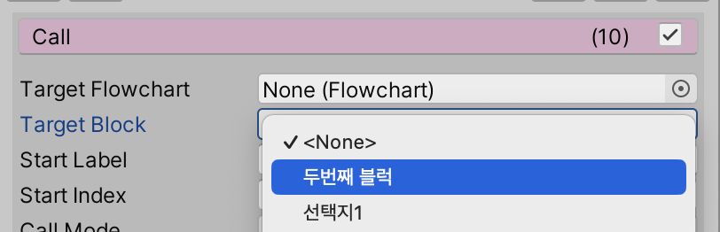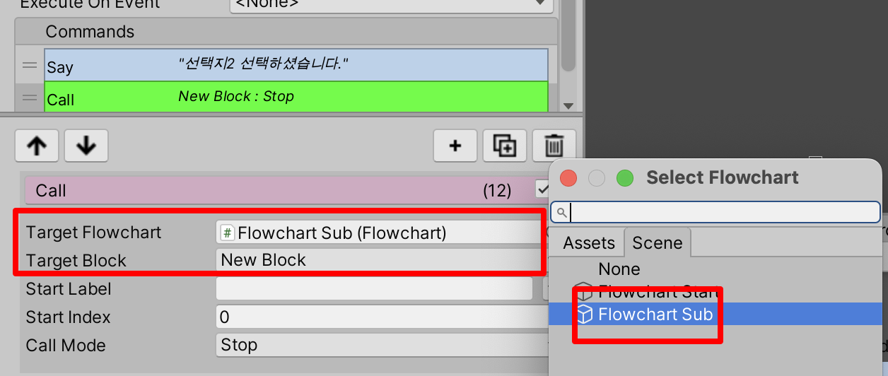 Block 이동 때처럼 선택지2 블럭에 Call Command를 추가하고, Target Flowchart, Target Block을 지정해 줍니다.