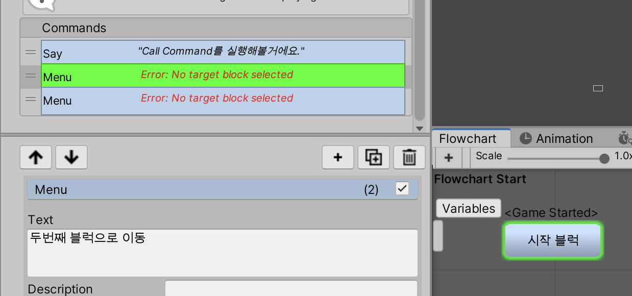 Menu 첫 번째는 "두 번째 블럭으로 이동"으로 출력하고 같은 Flowchart 내에서 다른 블럭으로 이동할 선택지가 될 것이고, Menu 두 번째는 "두 번째 플로우차트로 이동"으로 출력하고 다른 Flowchart의 블럭으로 이동할 선택지가 될 예정입니다.