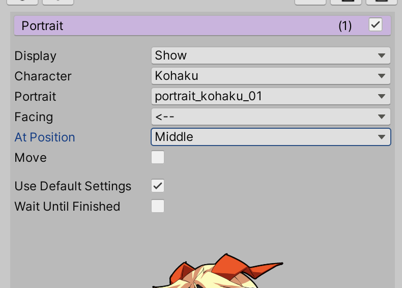 Character 가장 하단에 보면 Portraits Face가 있는데, 스프라이트가 왼쪽을 바라보면 왼쪽, 오른쪽을 바라보면 오른쪽을 선택해 줍니다.