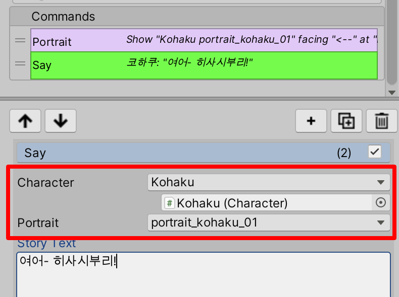 Character에 아까 전에 추가했던 스프라이트들을 Portraits에 추가해 줍니다.