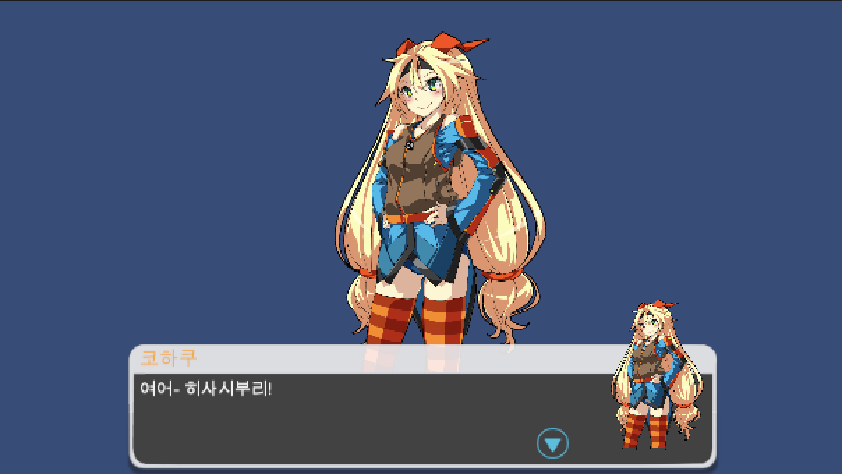 위 설정대로 실행하게 되면, Portrait Command로 출력한 캐릭터와 Say Command로 출력한 캐릭터가 둘 출력되게 됩니다.