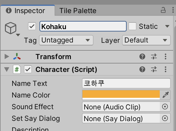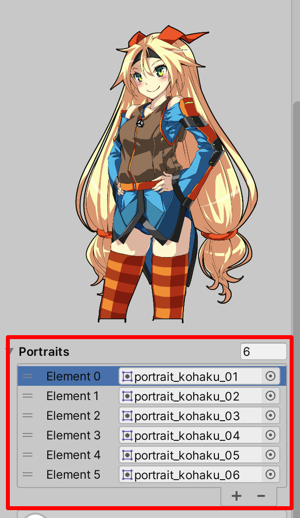 Character에 아까 전에 추가했던 스프라이트들을 Portraits에 추가해 줍니다.