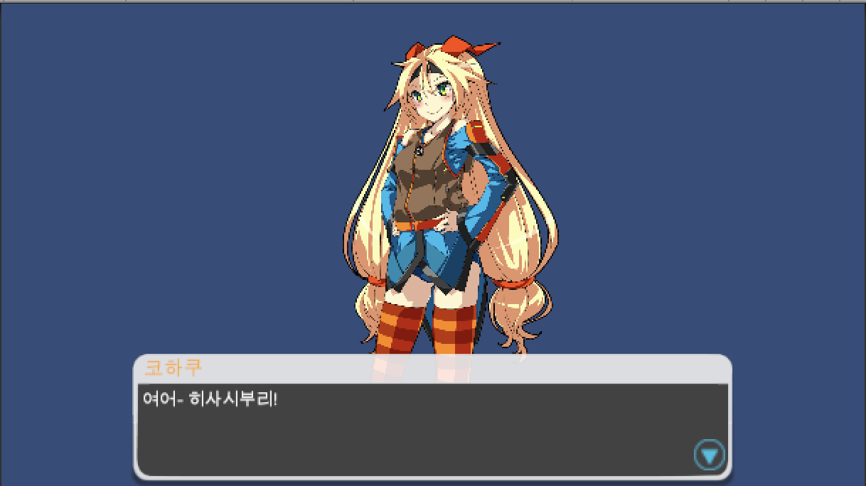 위 설정대로 실행하게 되면, Portrait Command로 출력한 캐릭터와 Say Command로 출력한 캐릭터가 둘 출력되게 됩니다.