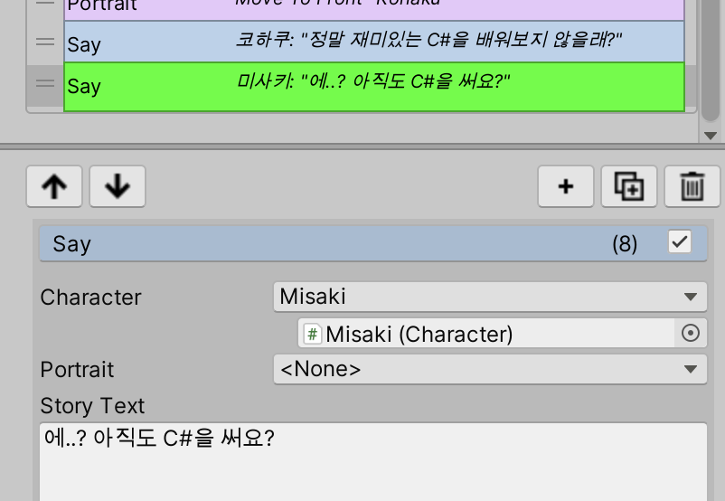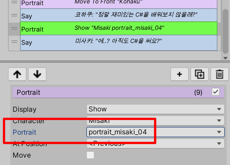 추가한 Say Command 이전에 Portrait Command를 추가하고 Display는 Show로 설정하고 Portrait을 원하는 표정으로 선택합니다.