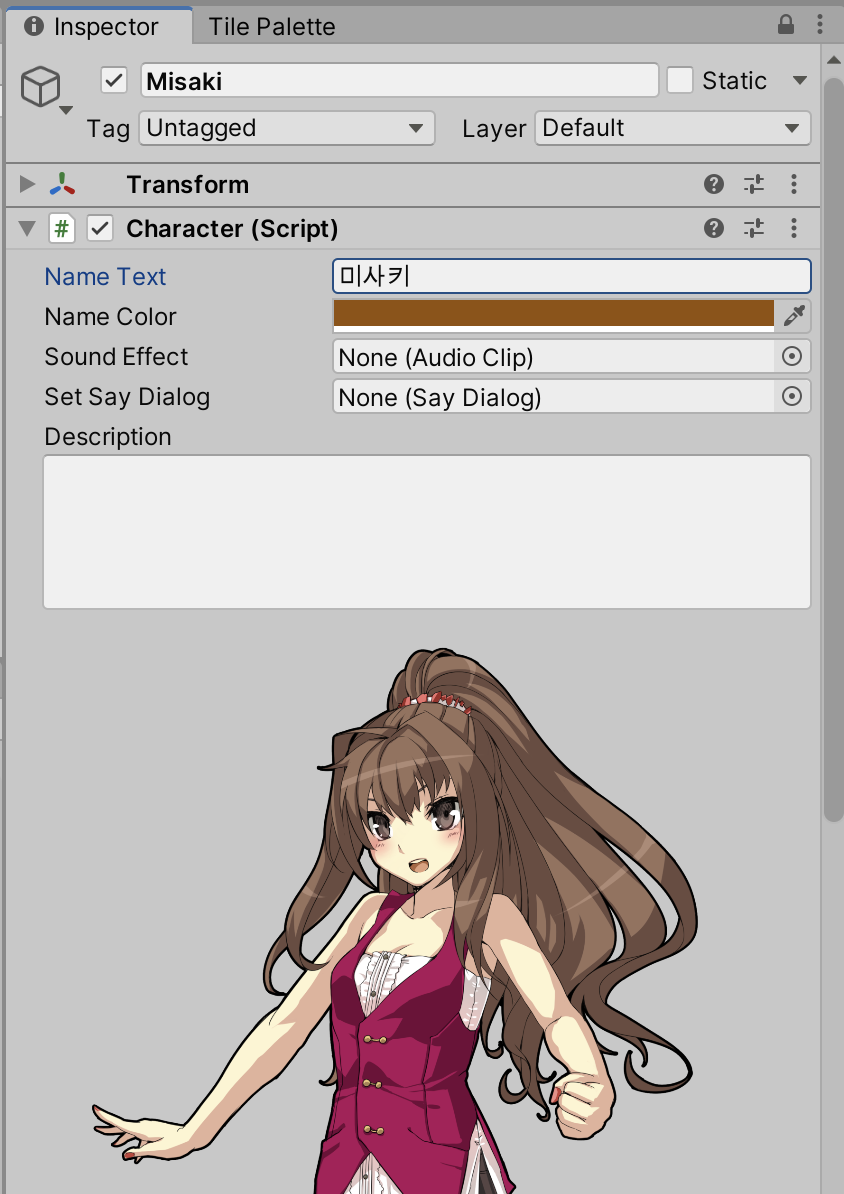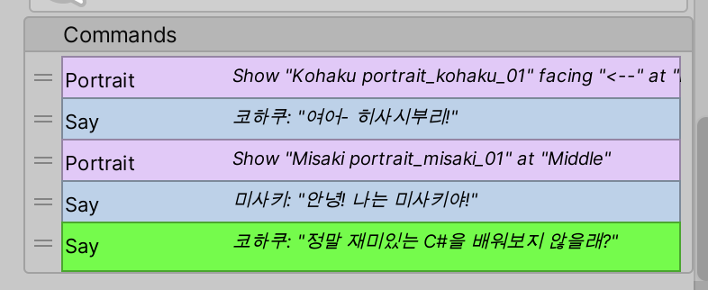캐릭터 Portrait을 추가하고 두 캐릭터가 대화하듯이 Say Command를 추가해 주었습니다.