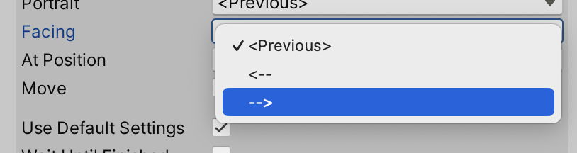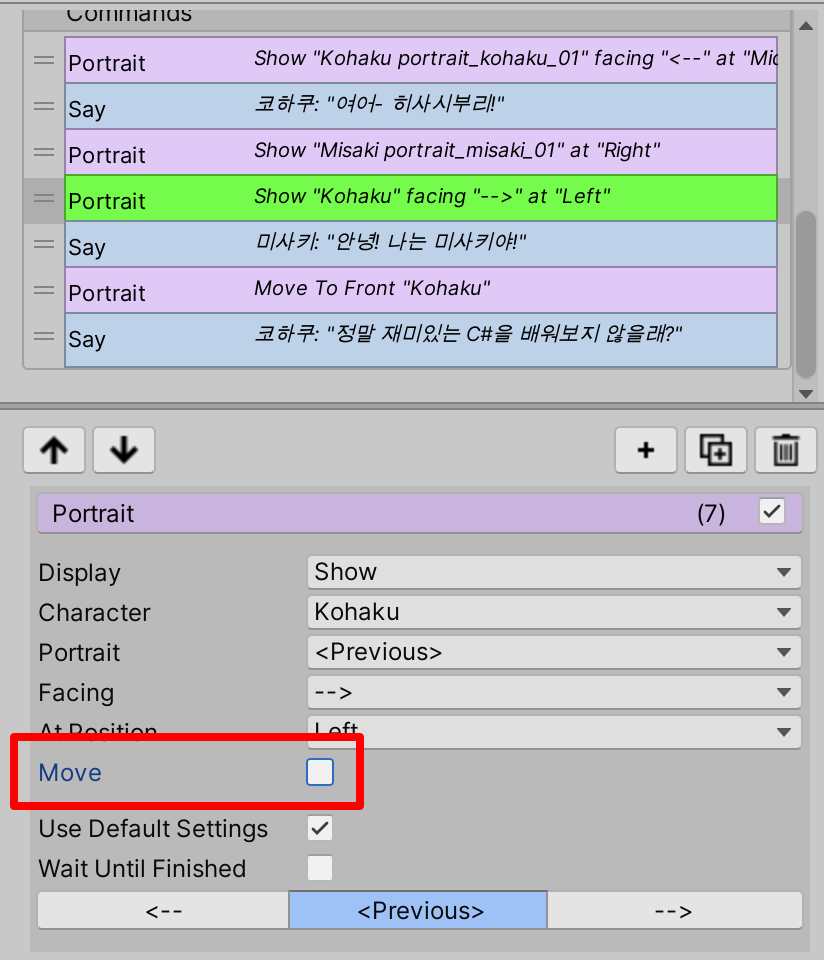 첫 번째 캐릭터를 왼쪽으로 이동시키는 Portrait Command를 선택하고 Move에 체크를 하면 간단하게 이동시킬 수 있습니다.
