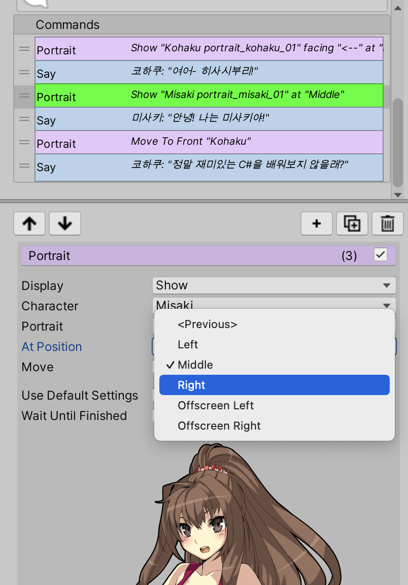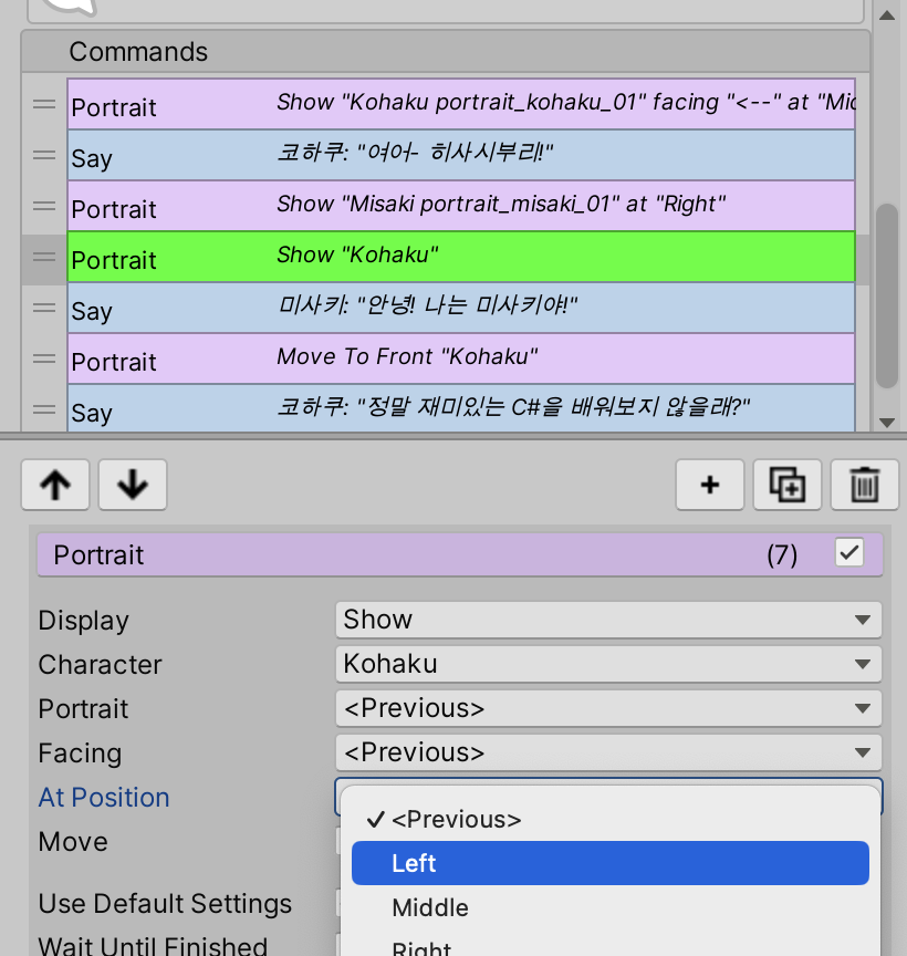 두번째 캐릭터 Portrait이 출력된 이후에 첫 번째 캐릭터는 왼쪽으로 가도록 Portrait Command를 추가하고 At Position을 Left로 설정해 줍니다.