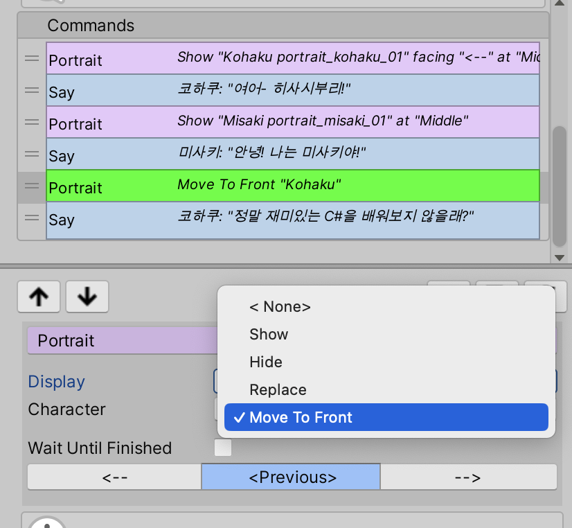 첫 번째 캐릭터가 말하기 전에 Portrait Command를 추가하고 Display를 Move To Front로 설정해 줍니다.