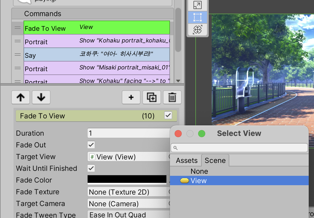 실행되는 Flowchart의 Block에 Fade To View Command를 추가해 주세요.
