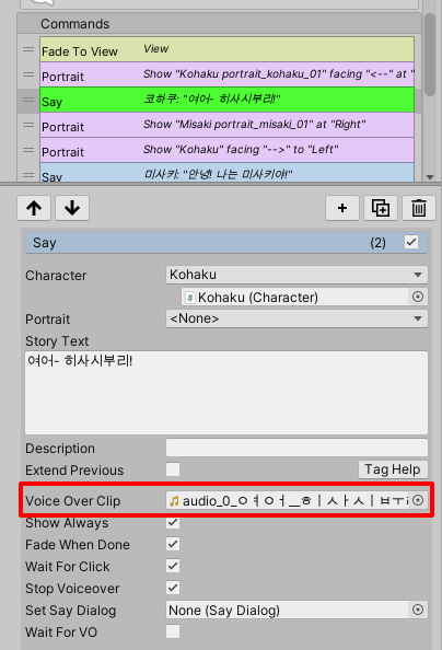 이전에 만들었던 Say Command에 Voice Over Clip 프로퍼티에 만들어준 보이스를 추가했습니다.