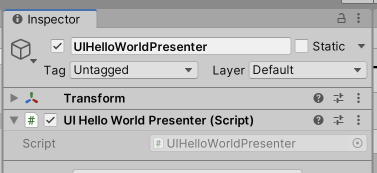 UIHelloWorldPresenter 이름으로 GameObject를 만들고 스크립트를 추가해 줍니다.