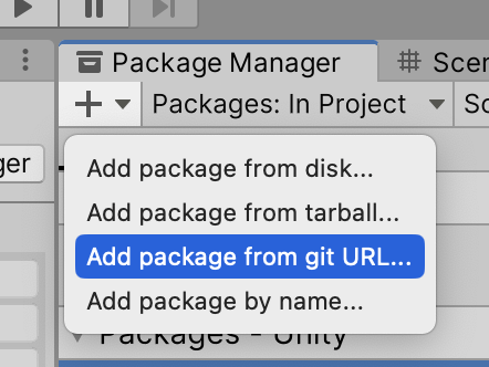 Package Manager 좌측상단 [+] 버튼을 클릭해서 [Add package from git URL...] 메뉴를 클릭합니다.