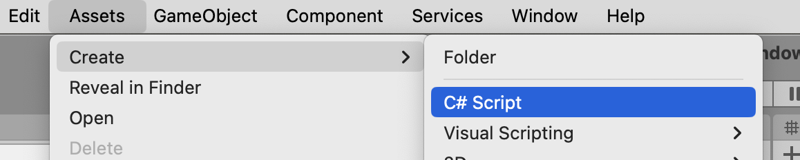 MonoBehaviour 스크립트 만들듯이 [C# Script]메뉴를 통해 생성합니다.
