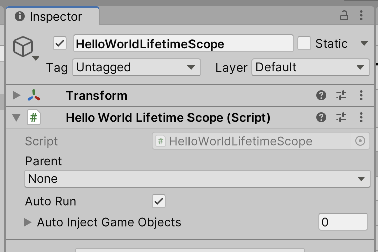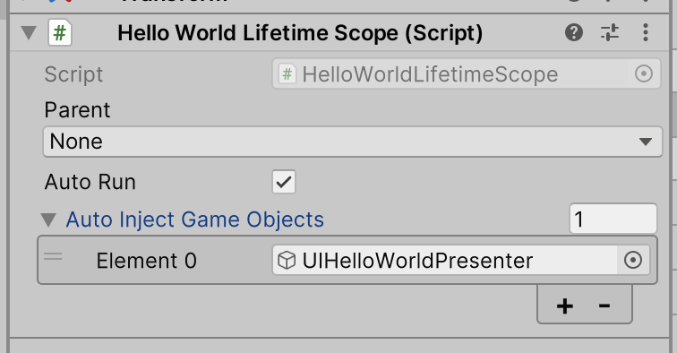 HelloWorldLifetimeScope 컴포넌트 [Auto Inject Game Objects] 항목에 UIHelloWorldPresenter 오브젝트를 추가해 줍니다.